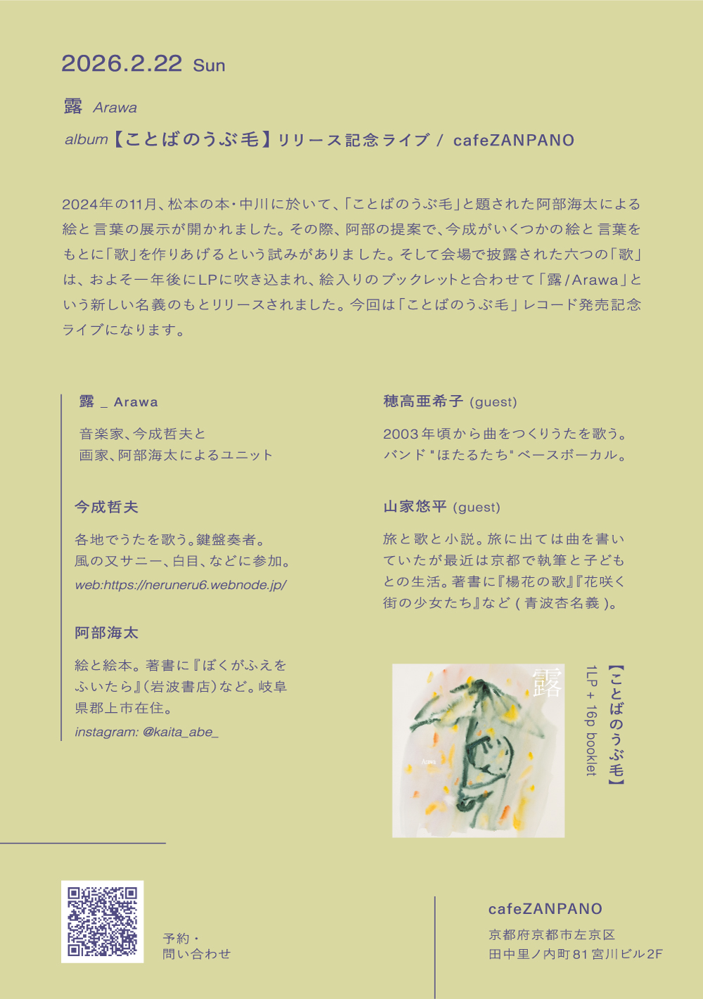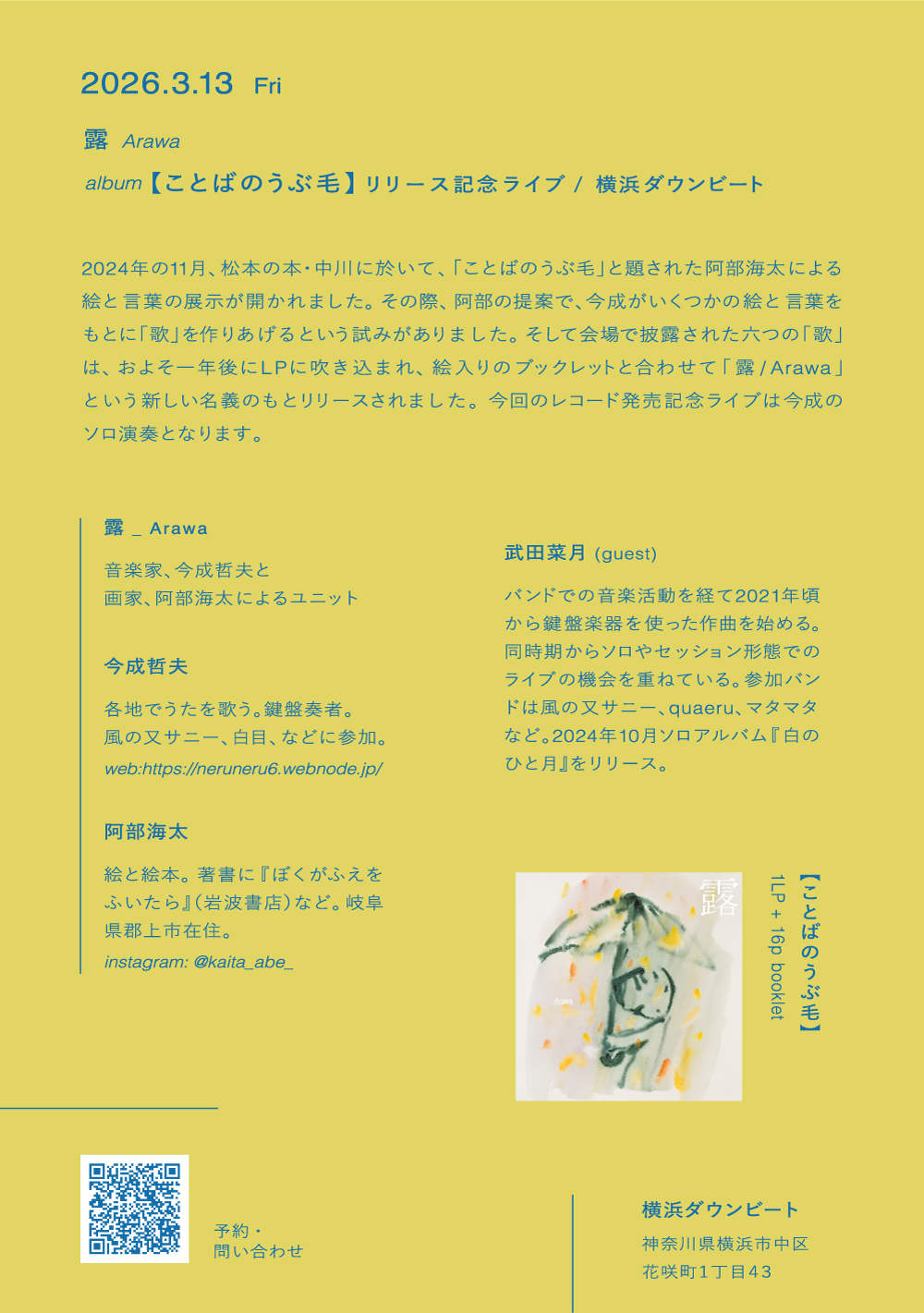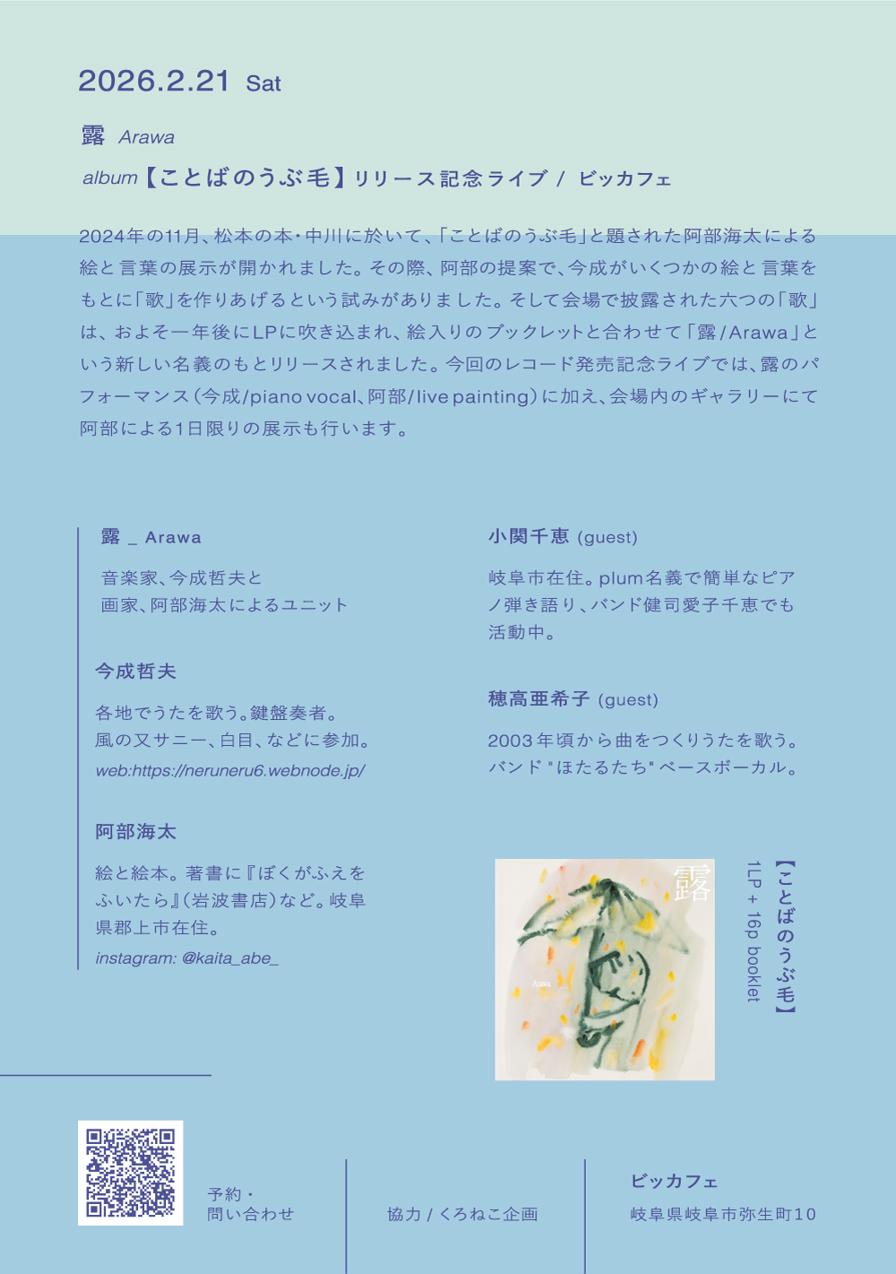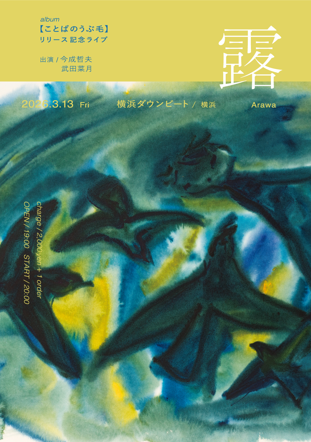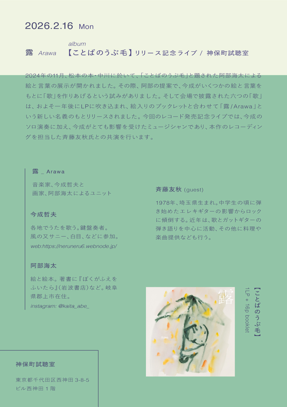 2024年の11月、松本の本・中川に於いて、「ことばのうぶ毛」と題された阿部海太による絵と言葉の展示が開かれました。その際、阿部の提案で、今成がいくつかの絵と言葉をもとに「歌」を作りあげるという試みがありました。そして会場で披露された六つの「歌」は、およそ一年後、LPに吹き込まれ、絵入りのブックレットと合わせて「露/Arawa」という新しい名義のもとリリースされました。今回のレコード発売記念ライブは、今成のソロ演奏となります。自身のうたに交えて、「ことばのうぶ毛」を飛ばします。
