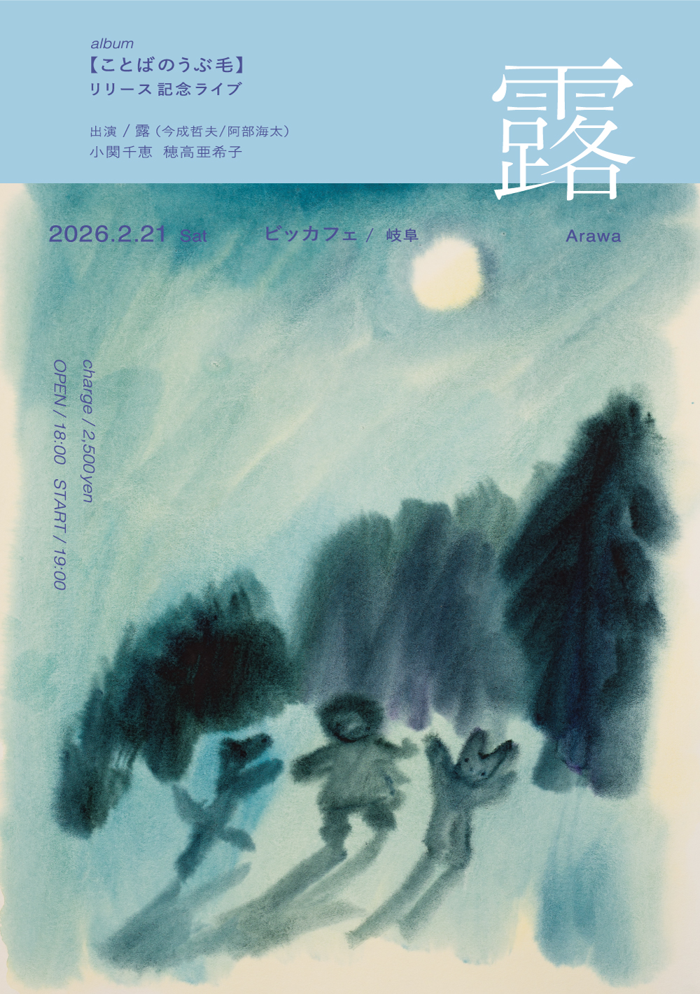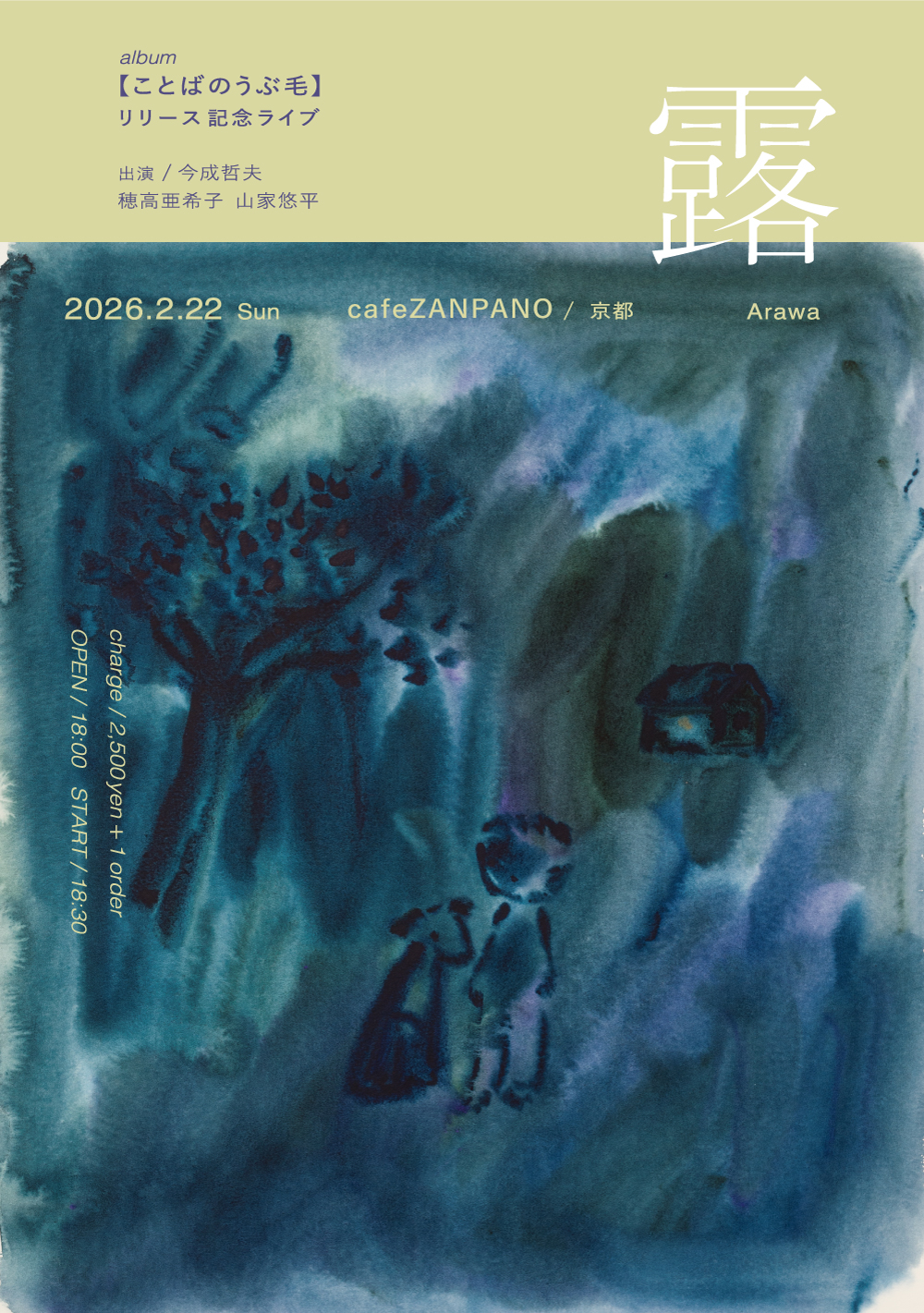 2024年の11月、松本の本・中川に於いて、「ことばのうぶ毛」と題された阿部海太による絵と言葉の展示が開かれましたその際、阿部の提案で、今成がいくつかの絵と言葉をもとに「歌」を作りあげるという試みがありました。そして会場で披露された六つの「歌」は、およそ一年後、LPに吹き込まれ、絵入りのブックレットと合わせて「露/Arawa」という新しい名義のもとリリースされました。今回のレコード発売記念ライブは、今成のソロ演奏となります。自身のうたに交えて、「ことばのうぶ毛」を飛ばします。